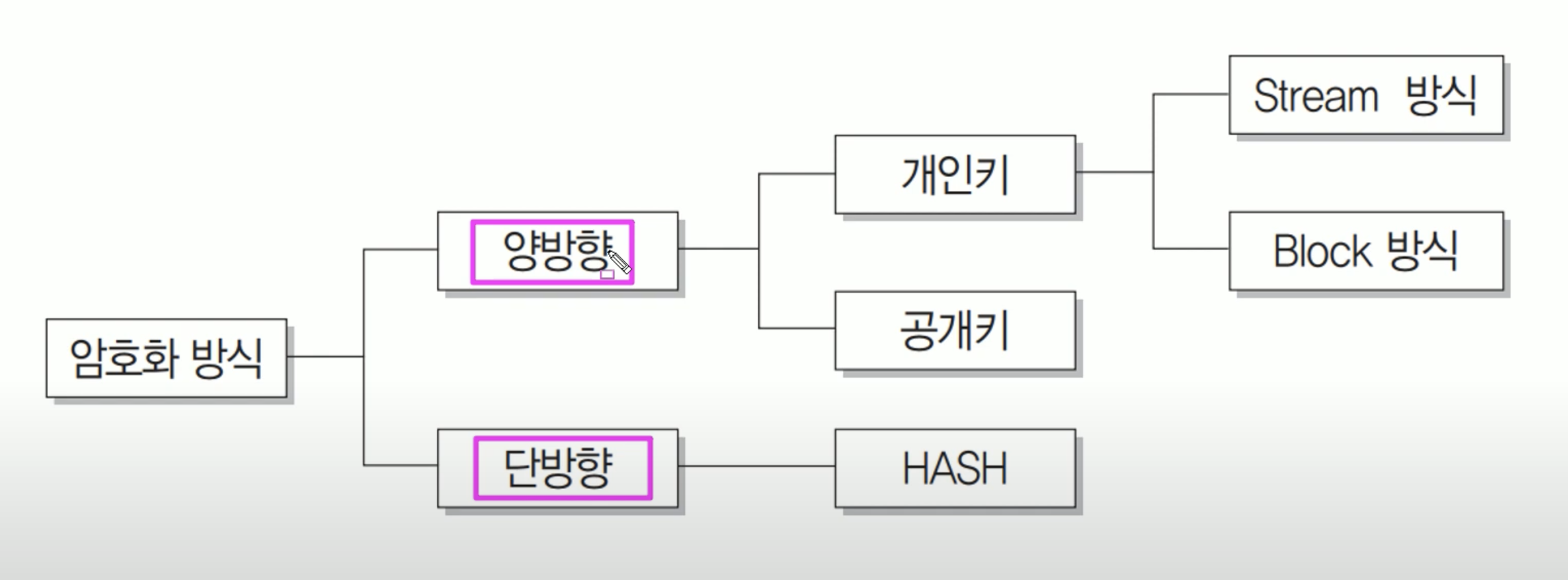 암호화 방식은 크게 보면 양방향, 단방향으로 나눌 수 있습니다. 단방향에는 HASH 하나가 존재합니다. 양방향에는 개인키, 공개키 크게 2가지로 나눌 수 있습니다. 개인키 암호화 방식에는 Stream 방식과 Block 방식으로 볼 수 있습니다.