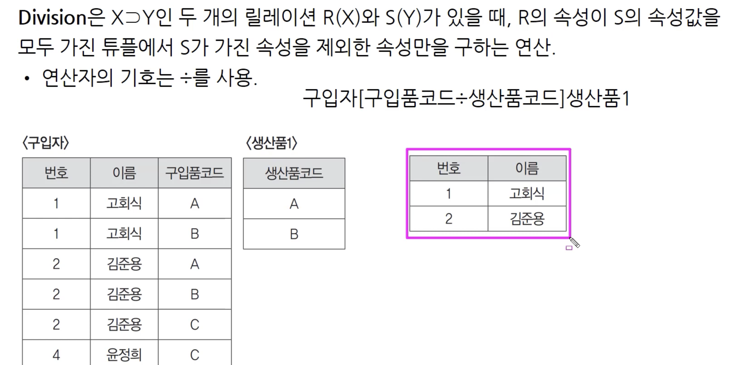 Division 은 A / B 라고 한다면 B가 가진 속성값을 모두 가진 A 튜플을 찾는데, B의 속성(열)을 제외한 나머지 열들만 가져오는 연산인데요. 말로 봐선 이해하기가 어렵습니다. 위의 예시를 보면 이해하기 쉽습니다.