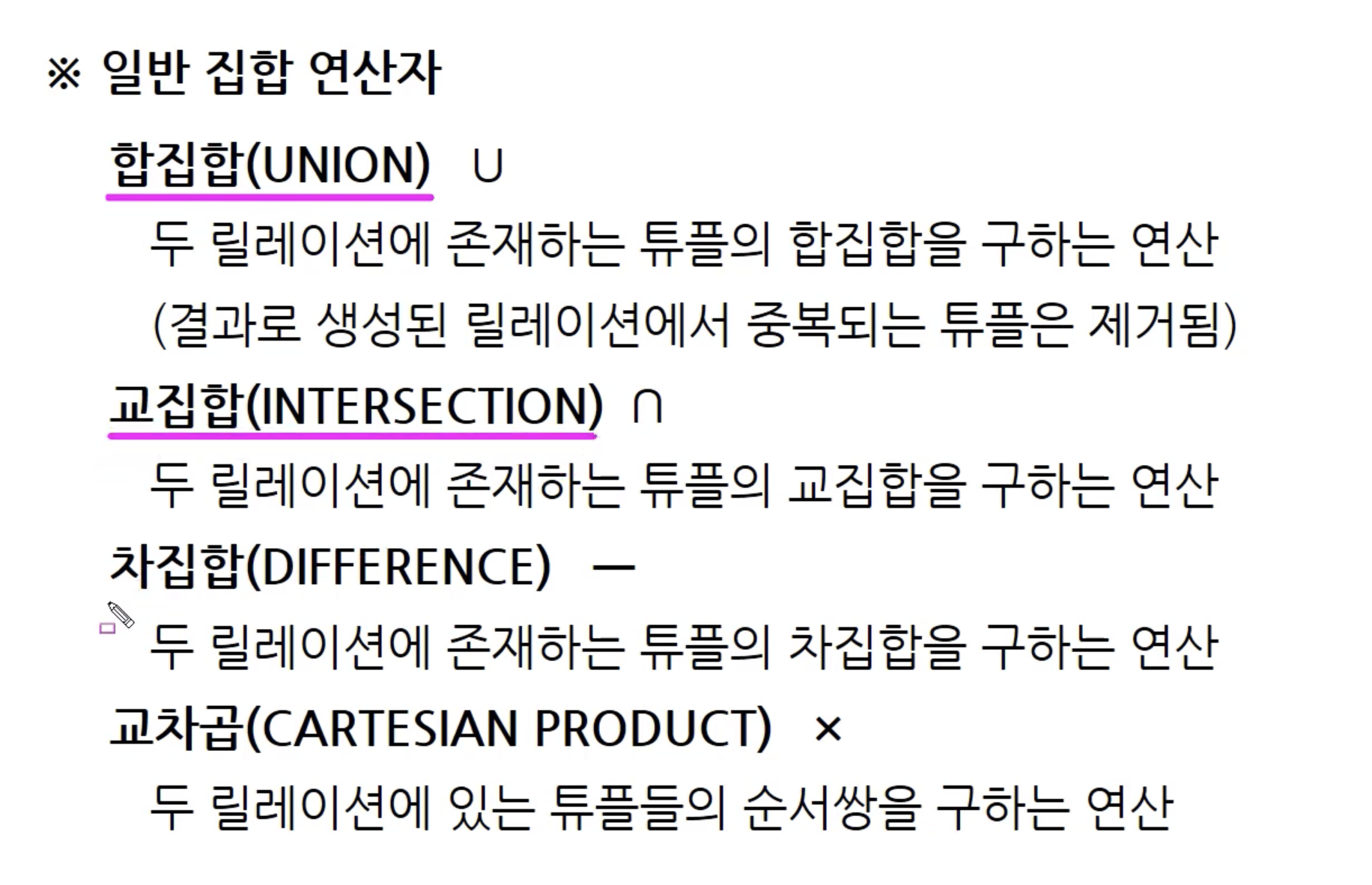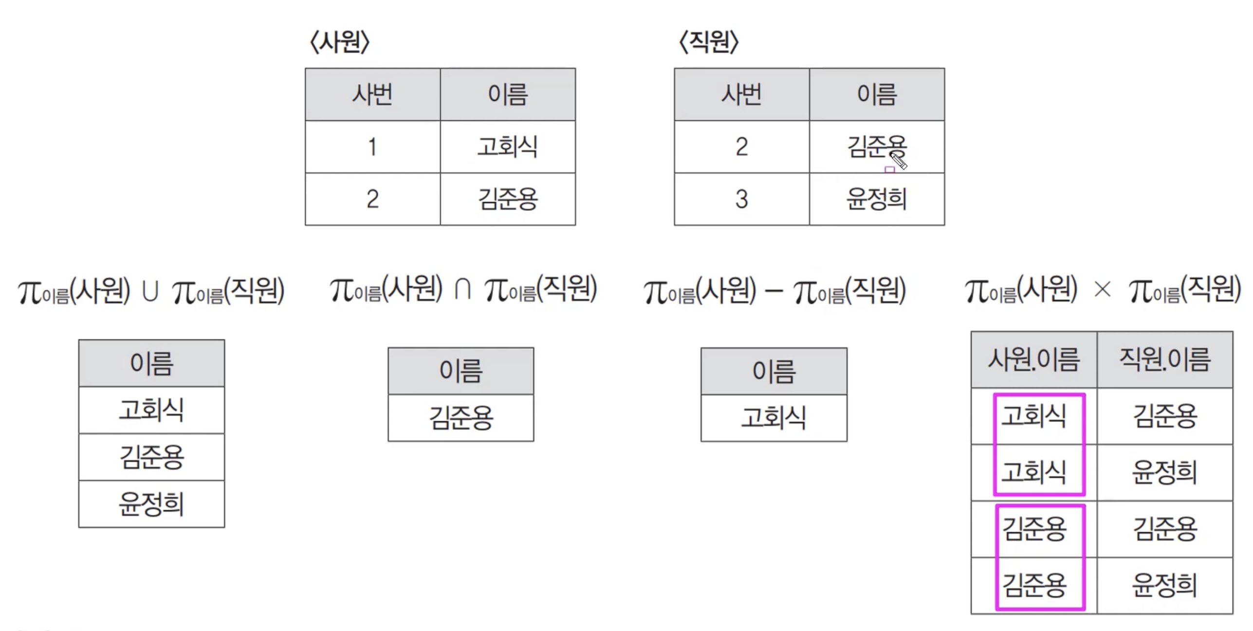 주의할 점이 있는데요. 파이(프로젝트) 연산이 그랬던 것처럼 합집합도 중복되는 튜플은 제거하는 특징이 있습니다. 합집합이라고해서 중복 제거를 안한다는 착각을 하지 않는 것이 중요하겠습니다.
