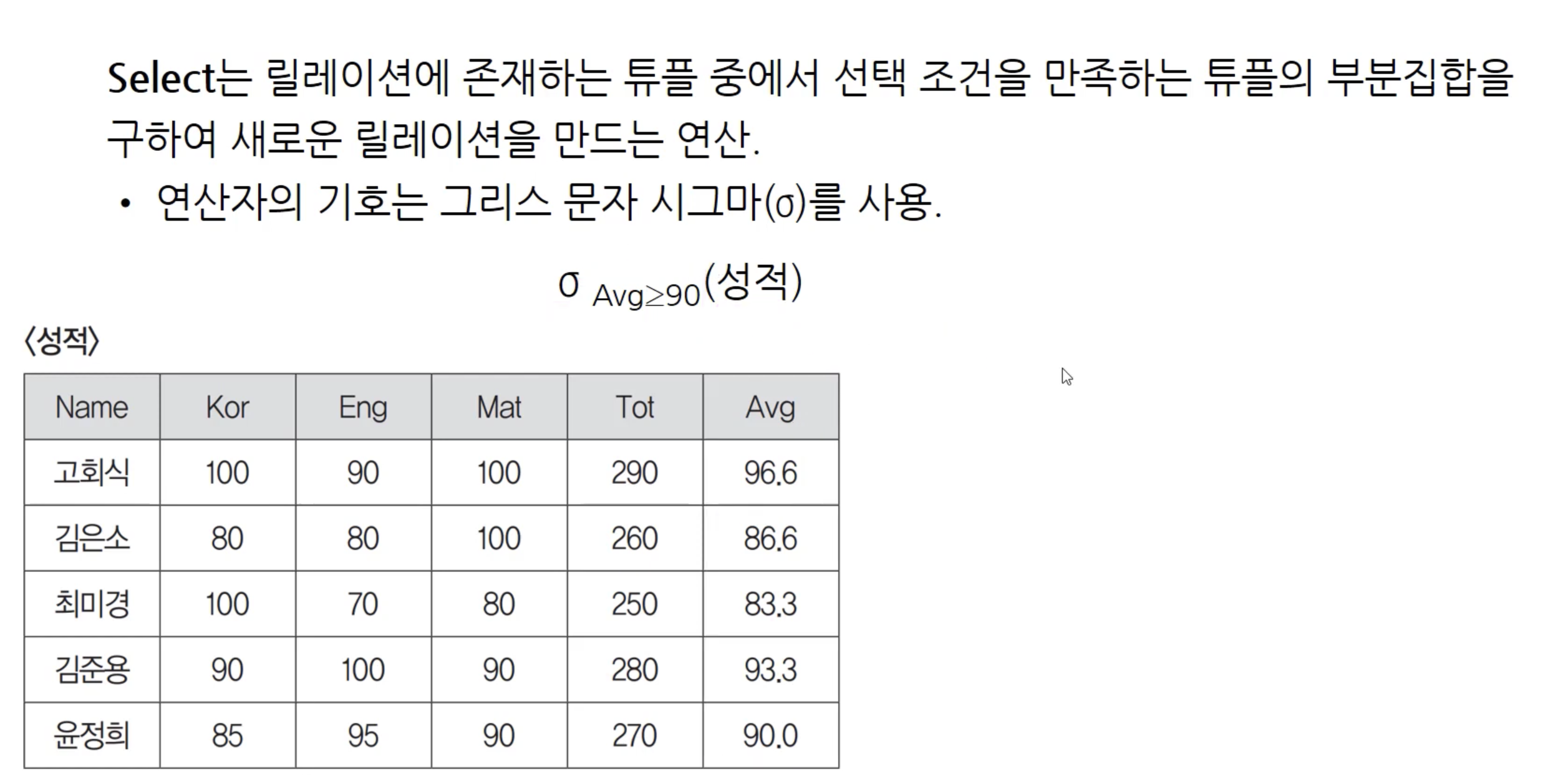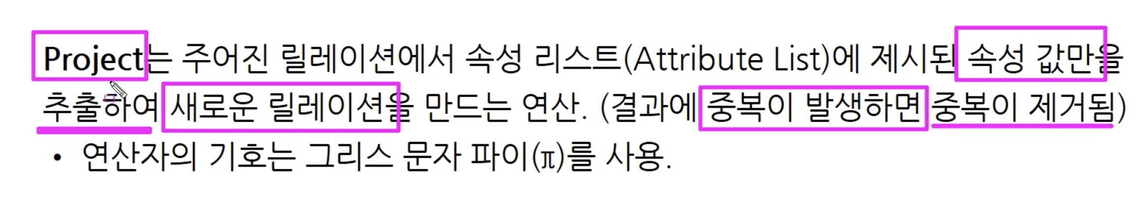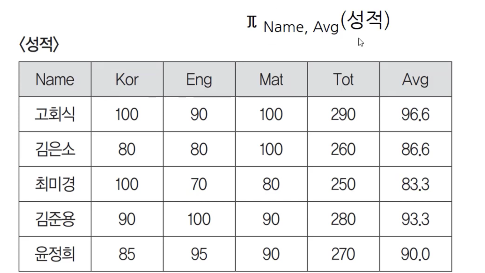 다른 예시도 하나 더 보겠습니다. 파이 - 프로젝트 연산은 중복값은 제외해주는 것을 잊지 맙시다! 수직 연산자라고 부르기도 합니다. 속성을 기준으로 값들을 가져오기 때문입니다. 반대로 시그마 셀렉트는 조건에 맞는 튜플들을 가져오는 특성 때문에 수평 연산자라고 합니다.