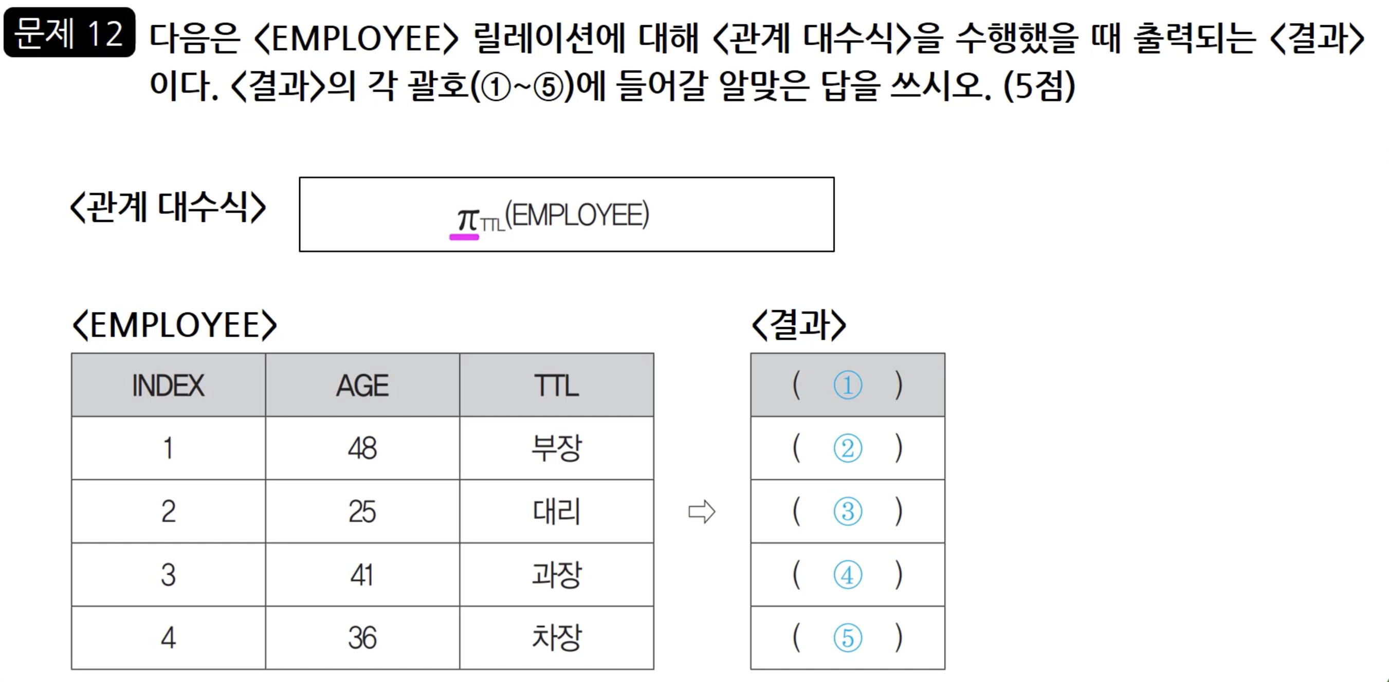 파이 연산자가 보이는데, 파이는 프로젝트 연산자였고, 지정한 속성에 해당하는 값만 꺼내오는 역할을 수행하는 것이 프로젝트 연산자였습니다. 그래서 Employee 릴레이션의 TTL 속성을 꺼내오는 것이라고 이해할 수 있습니다. 따라서 결과는 TTL 속성과 속성값들이 출력되게 됩니다.