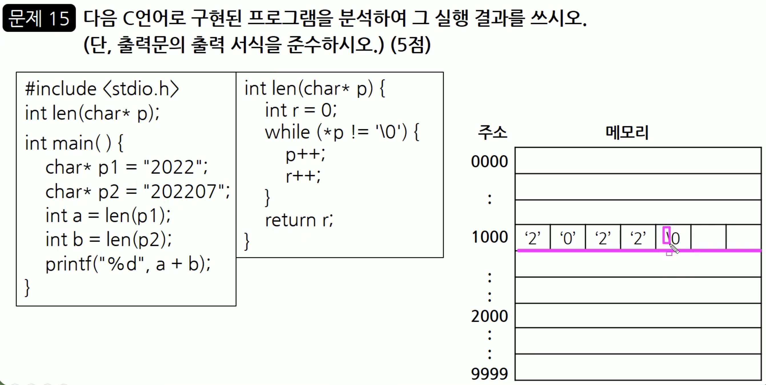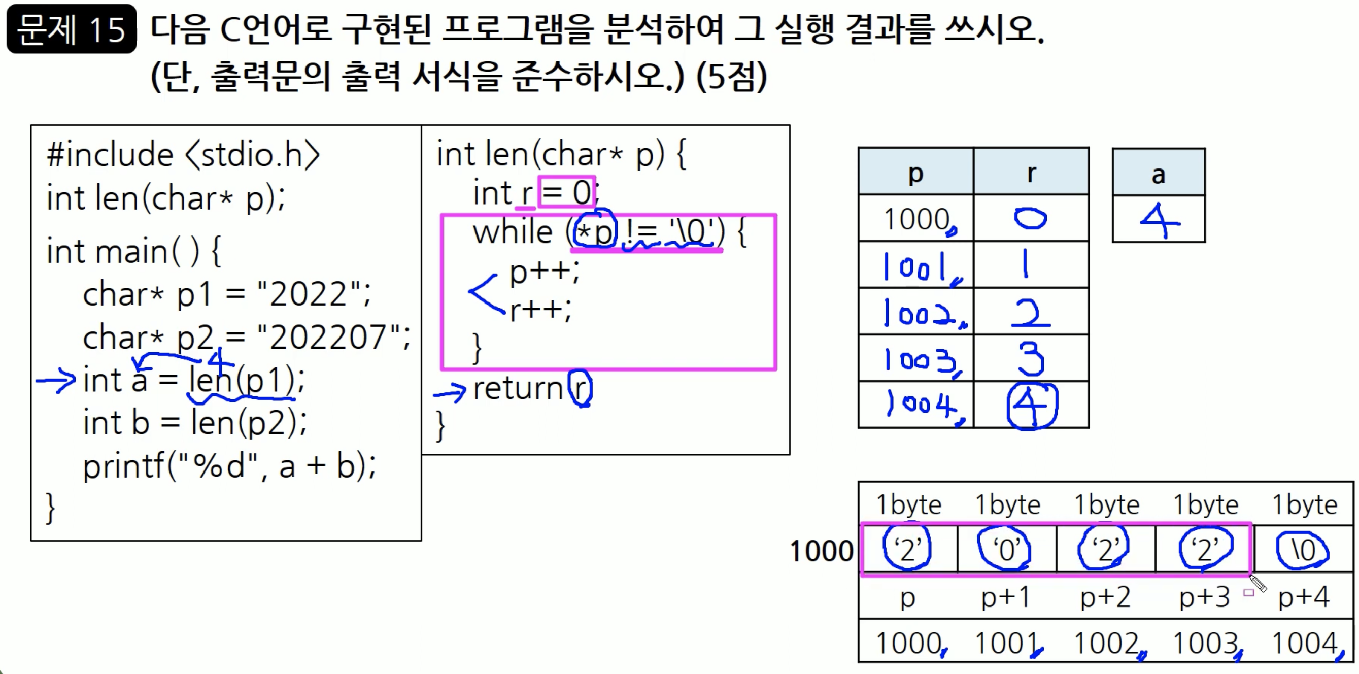 1000 이라는 주소에는 위와 같이 데이터가 입력이 되어 있을 건데요. char 는 각각이 1바이트의 크기를 갖습니다. p라는 포인터 변수는 1000은 가리키고 있는데요. 1000 번지에는 '2' 가 1바이트의 크기를 가지고 자리하고 있고, 이어서 1001 번지에 '0', 1002 번지에 '2' ... 이런 식으로 저장되어 있다고 이해할 수 있습니다. 그래서 이것을 표로 표현하면 위와 같습니다. 따라서 len( ) 이라는 함수는 문자의 개수를 세어주는 함수라는 것을 알 수 있습니다.