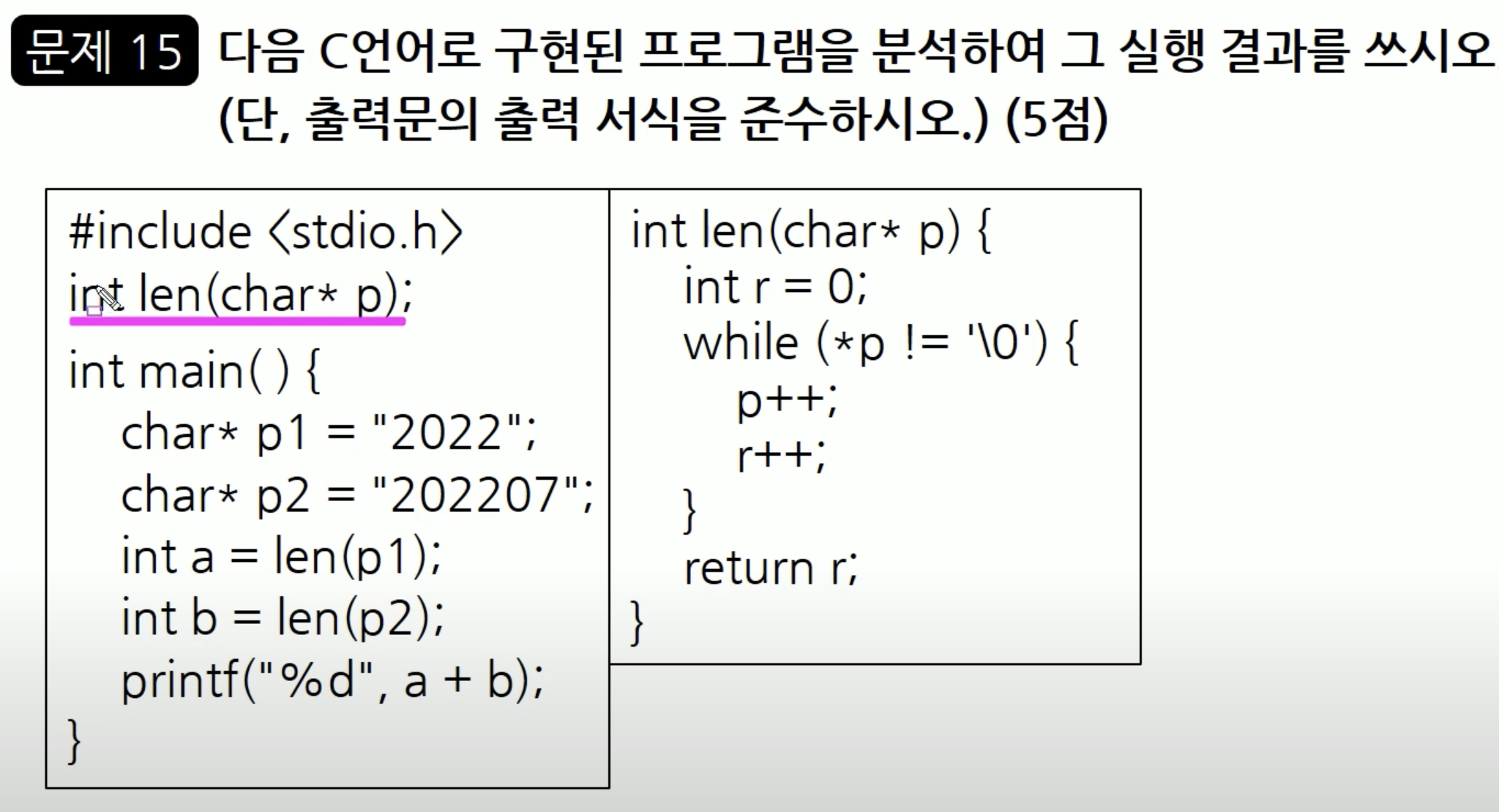 제일 첫 줄에 int len(char* p); 가 있는데요. len 이라는 함수에 대해서 프로토타입을 선언을 해놓은 것입니다. len 이라는 함수는 정수형이고, 인수를 전달 받게 되면 char* p 라는 매개변수가 받게 된다는 것을 알 수 있습니다.