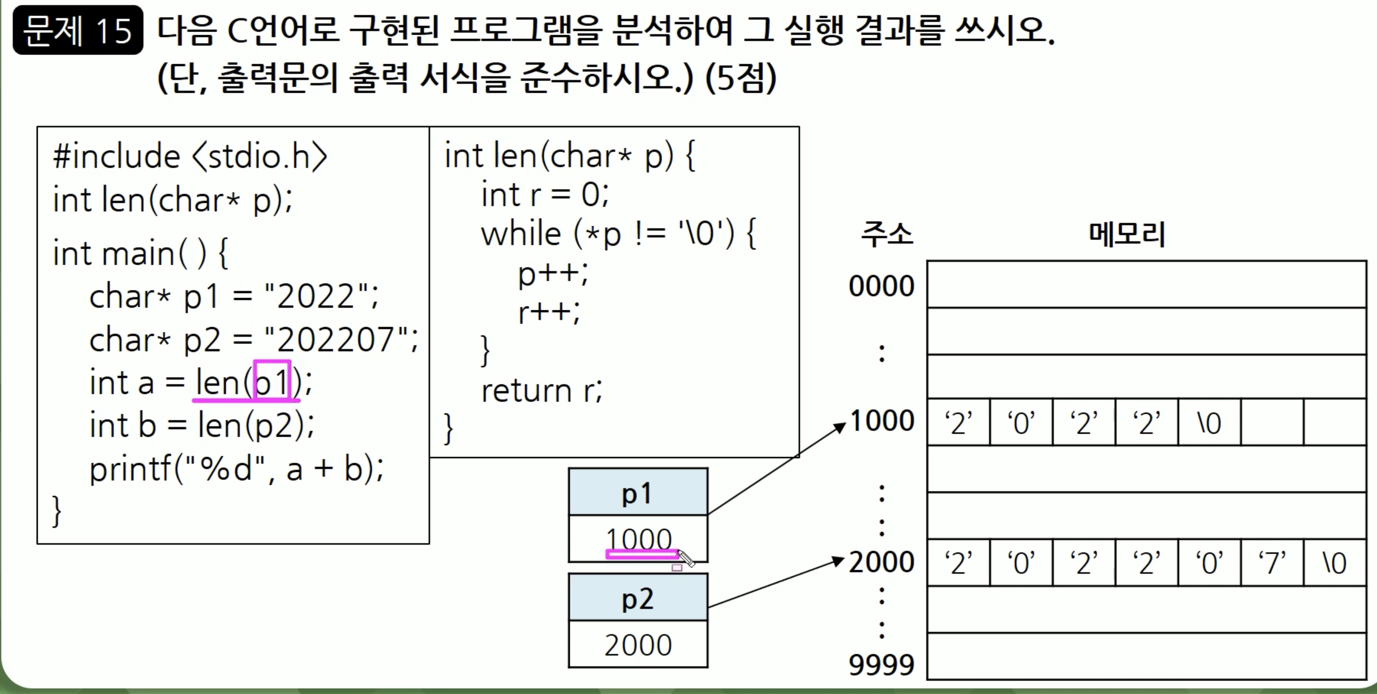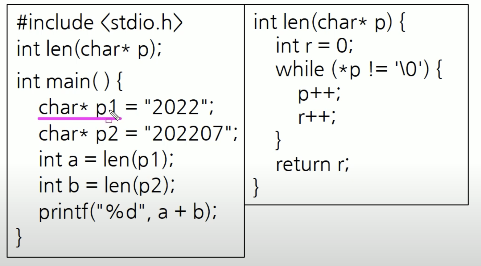 문자형 포인터 변수 p1 과 p2 는 위에서 보는 것과 같이 주소를 갖고 있게 됩니다. 그래서 len(p1) 을 실행하게 되면 len 의 매개변수인 char* p 라는 문자형 포인터 변수가 받게 됩니다. 즉 len(p1) 은 len(1000) 과 마찬가지고 p 라는 문자형 포인터 변수는 1000이라는 값을 가지게 되는 것이죠.