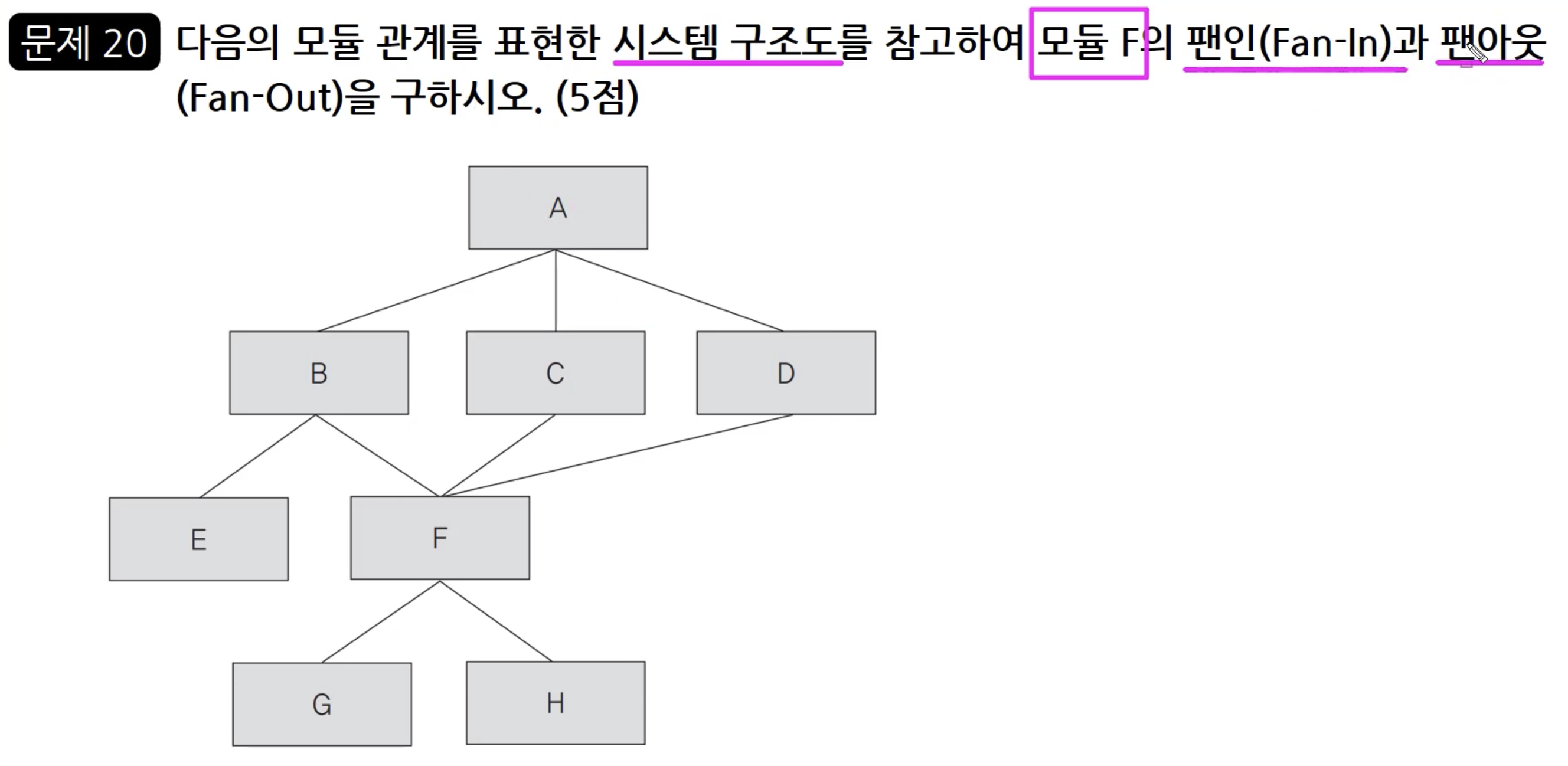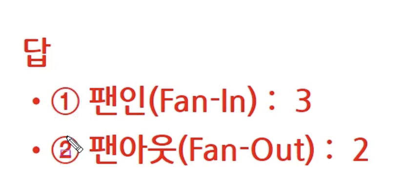 모듈 F의 팬인은 3이고, 아웃은 2입니다. 팬인을 B, C, D 라고 적으면 안됩니다!!! 개수를 숫자로 반환합니다!답을 적을 때는 위의 그림처럼 정확하게 명시를 해주어야 합니다.