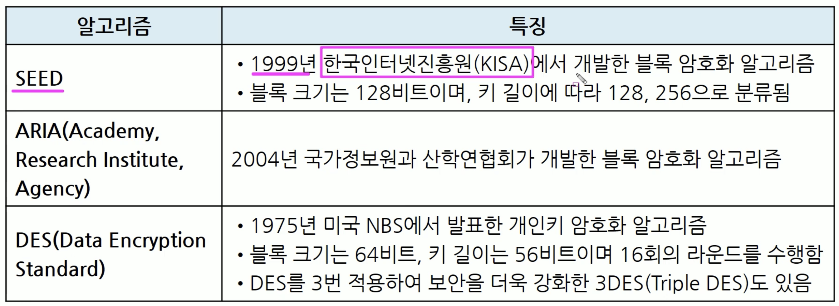 SEED : 한국인터넷진흥원(KISA) ARIA : 국가정보원과 산학연합회 개발. 블록 암호화 알고리즘 DES : NBS에서 개발. 개인키 암호화 알고리즘