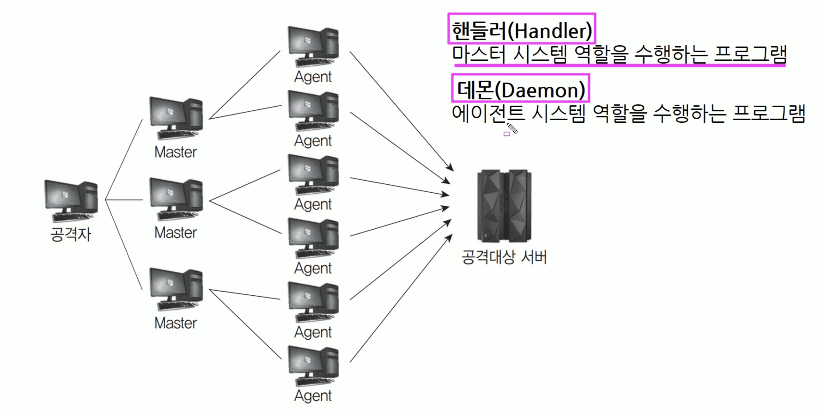 공격자가 취약점에 있는 컴퓨터에 핸들러와 데몬을 설치하는데요. 핸들러가 설치된 컴퓨터를 마스터라고 합니다. 마스터들은 공격자로부터 직접적인 명령을 받는 컴퓨터들입니다. 데몬이 설치된 컴퓨터는 에이전트라고 하고 마스터들의 명령을 받습니다. 에이전트들은 공격대상 서버를 공격하게 됩니다. 위와 같은 공격 방식은 DDoS라고 합니다.