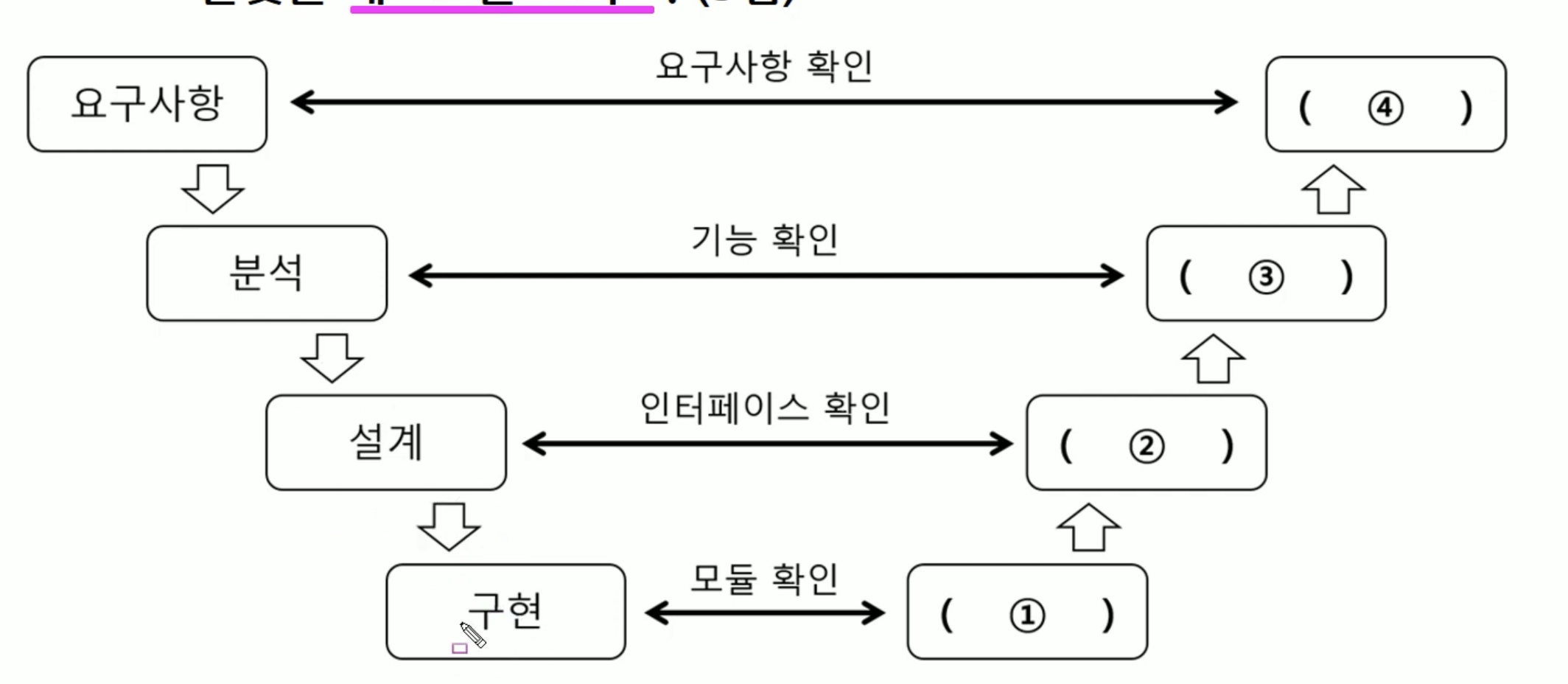 요구사항을 받으면, 분석을 한다음 요구사항 분석을 토대로 설계를 진행하고, 설계도를 보고 실제로 구현을 하게 됩니다. 구현을 할 때는 단위 테스트를 하게 됩니다. 단위 테스트가 완료된 모듈들을 결합하여 하나의 시스템으로 완성시키는 과정에서 테스트를 하는데요. 그것을 통합 테스트라고 합니다. 단위 테스트가 끝난 다음 모듈 결합한 통합 테스트가 완료되고 나면, 그것들의 기능이 정상적으로 동작하는지 시스템 전체의 테스트를 진행하는데요. 그것을 시스템 테스트라고 합니다. 마지막으로 시스템 테스트 다음으로는 사용자의 요구사항을 충족하는지, 테스트를 하는데, 그것을 인수 테스트라고 합니다.